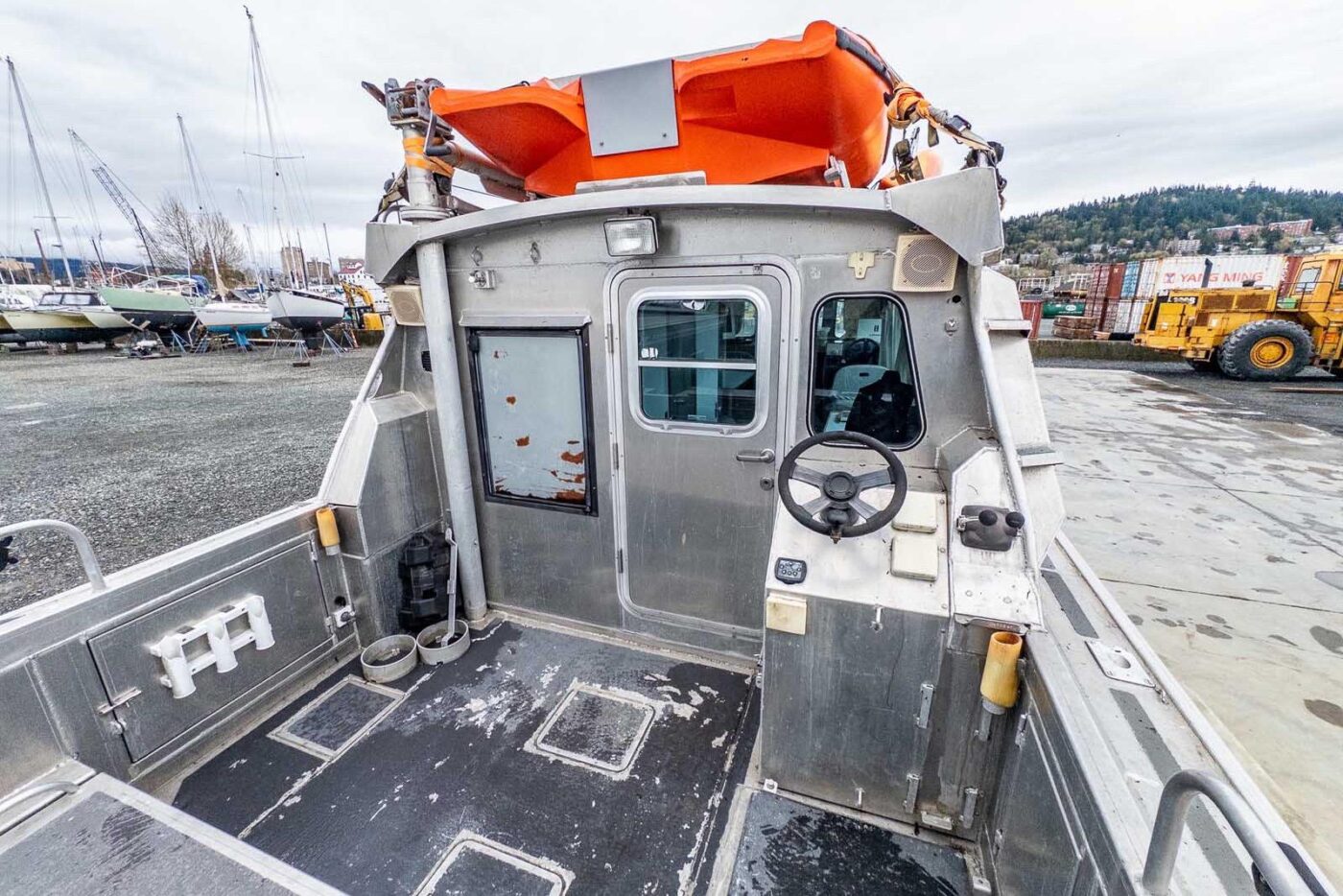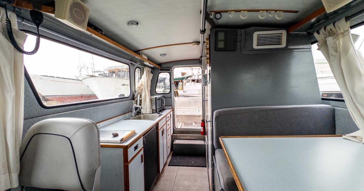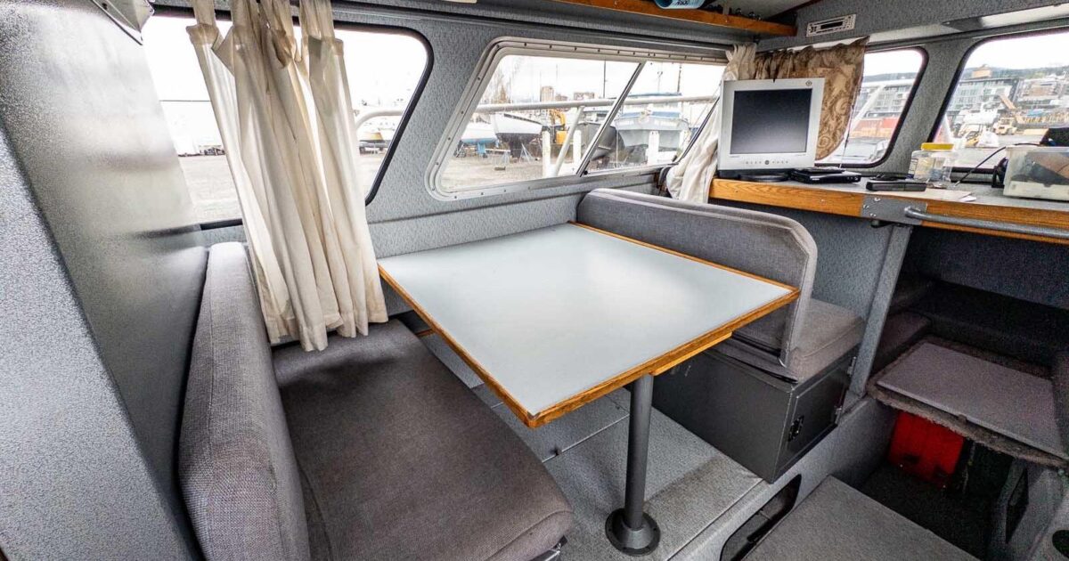 Interior cabin finish: interior powder-coating on exposed surfaces; light grey Chrysler marine vinyl flooring; vinyl covered plywood headliner with 1” foam insulation; light grey Chrysler marine vinyl on kick areas and on upper cabin structure and on horizontal dash surfaces