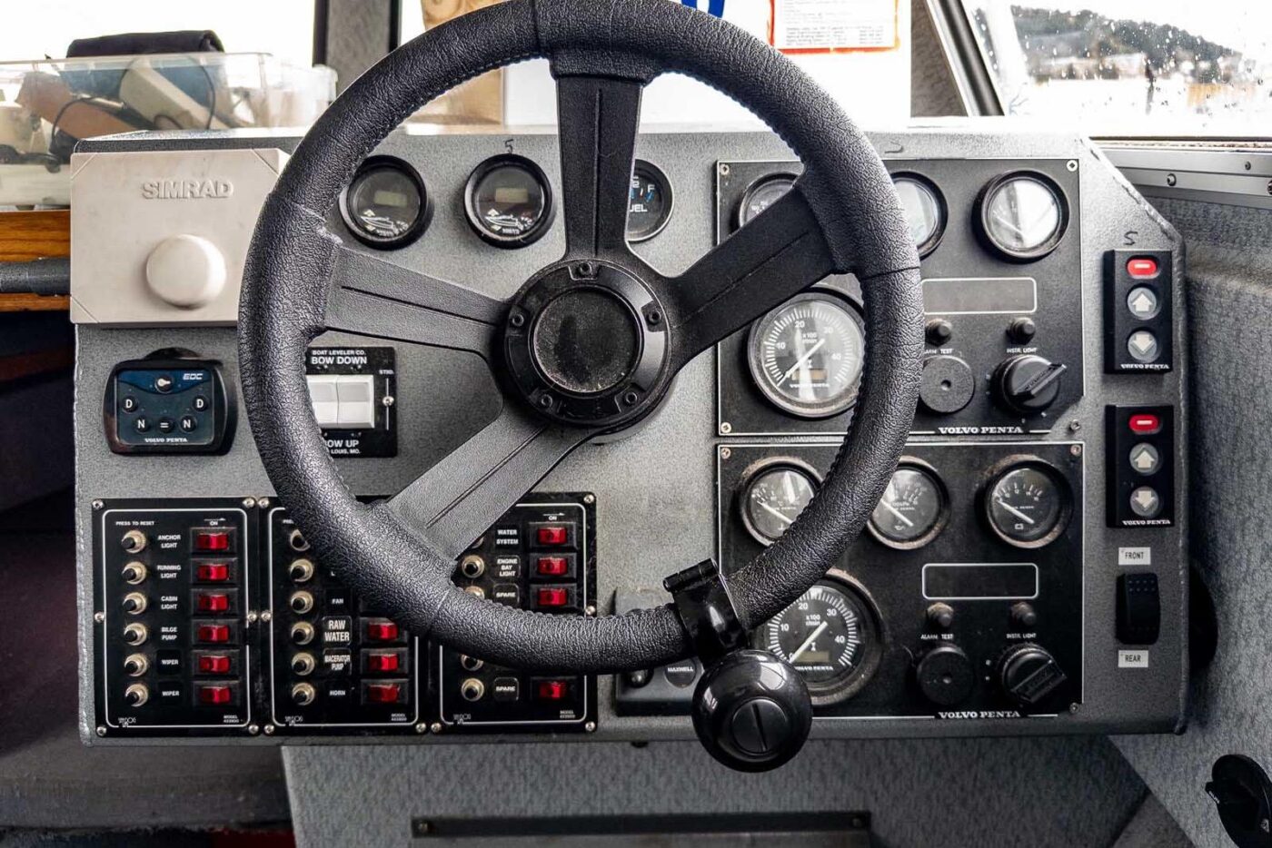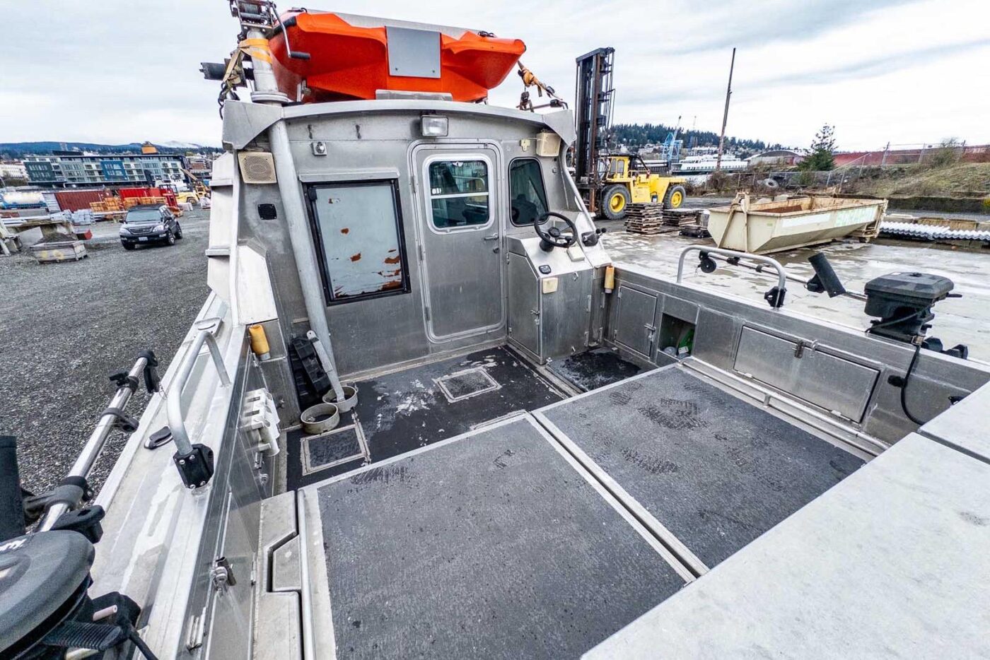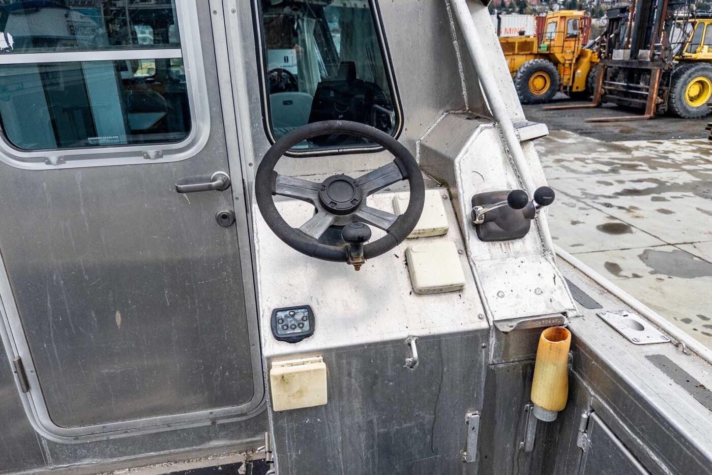 Interior cabin finish: interior powder-coating on exposed surfaces; light grey Chrysler marine vinyl flooring; vinyl covered plywood headliner with 1” foam insulation; light grey Chrysler marine vinyl on kick areas and on upper cabin structure and on horizontal dash surfaces