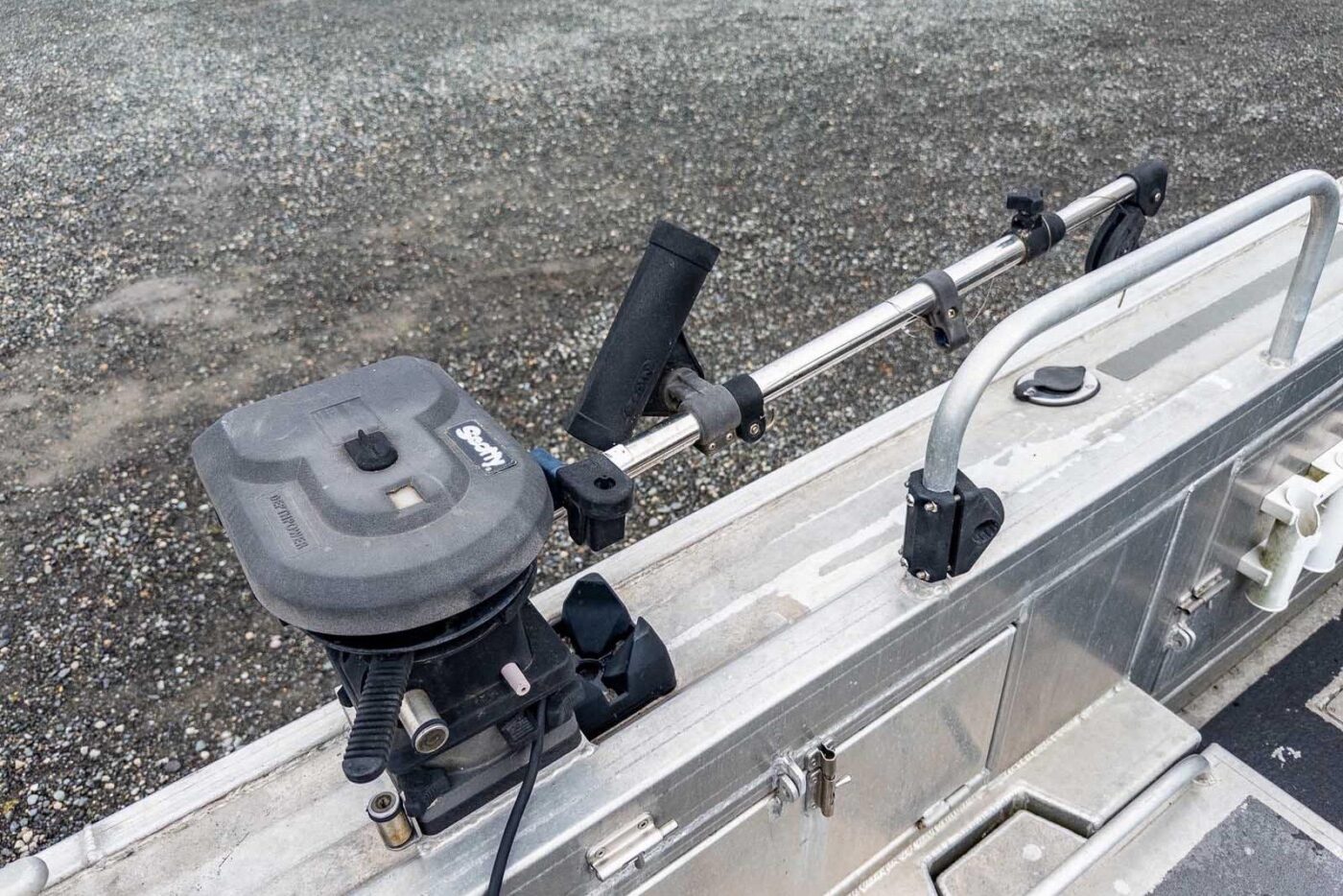 Garelick Heavy Duty S.S. kicker bracket (#71090) mounted on starboard side