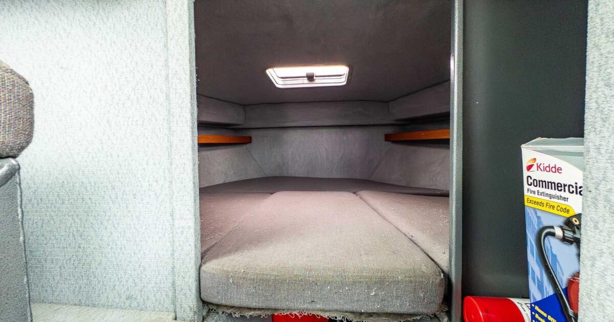 Port side dinette package converts to a two person bunk complete with upholstered cushions, table, storage in seats, and reversible backrest on co-pilot’s seat