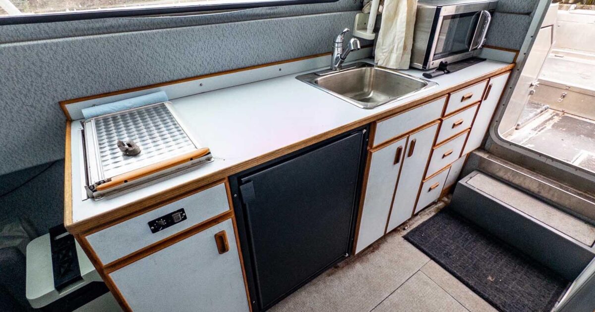 Wood galley package complete with house style sink, faucets, Origo two burner alcohol stove, 20 gallon freshwater tank, 6 gallon grey water holding tank, 3.3 GPM Shurflo pump, & hoses & fittings