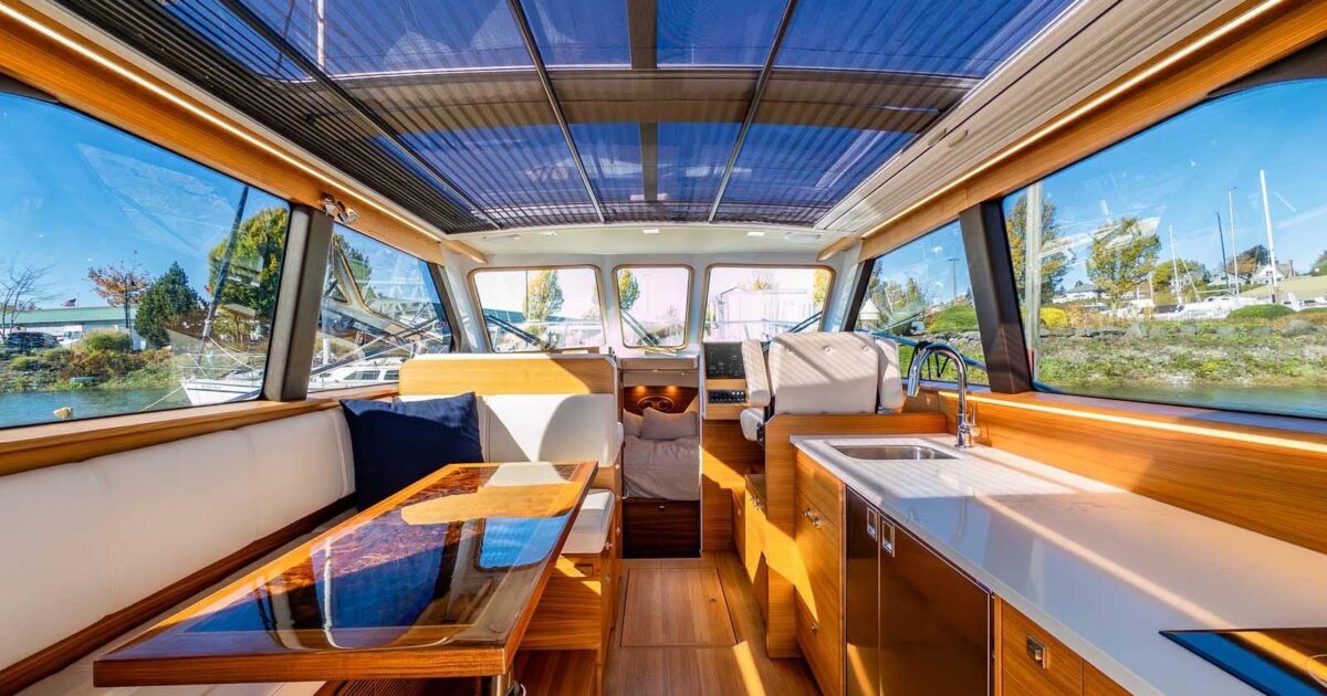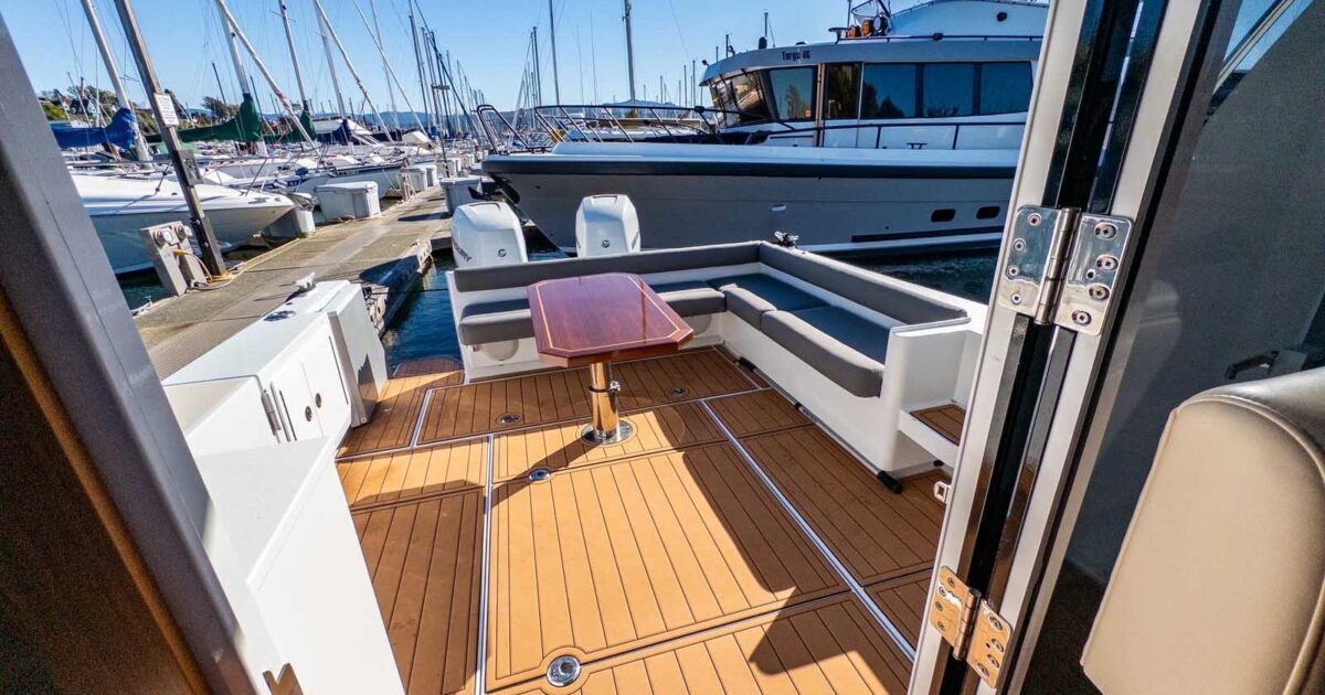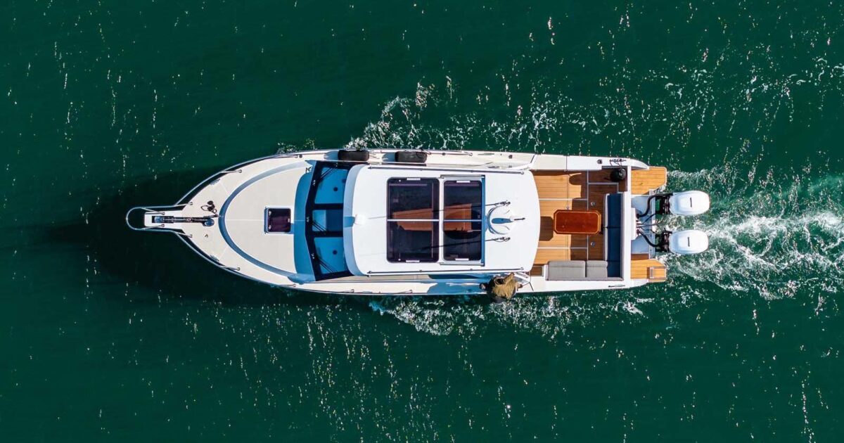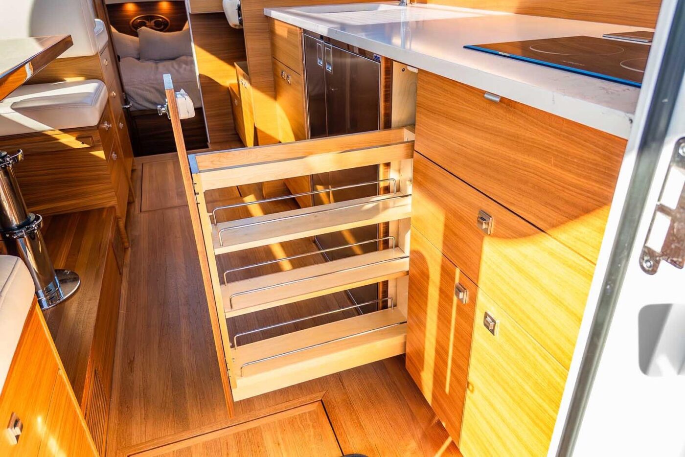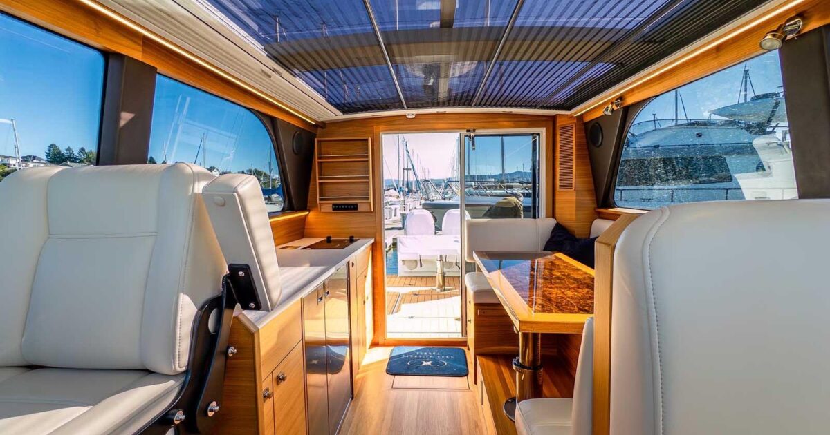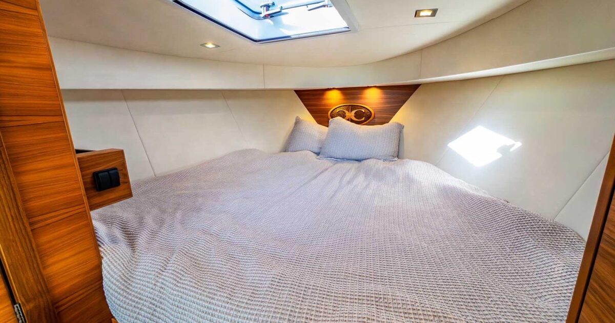 Inside, the 33 Express Fish offers true yacht-level comfort. The interior showcases handcrafted teak cabinetry and flooring, premium materials, and a level of finish rarely found in this size class. The salon provides a panoramic helm view and transforms effortlessly between open-air cruising and full weather protection. Open the sunroof and wide aft doors to invite in the fresh air and sound of the sea, or close them to enjoy a fully enclosed, temperature-controlled space.