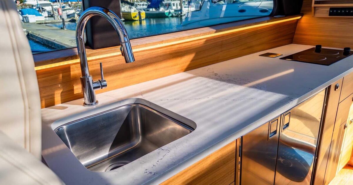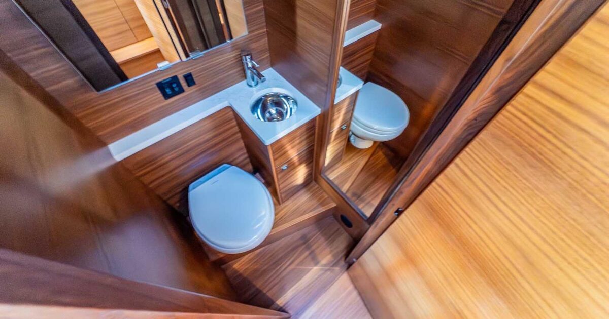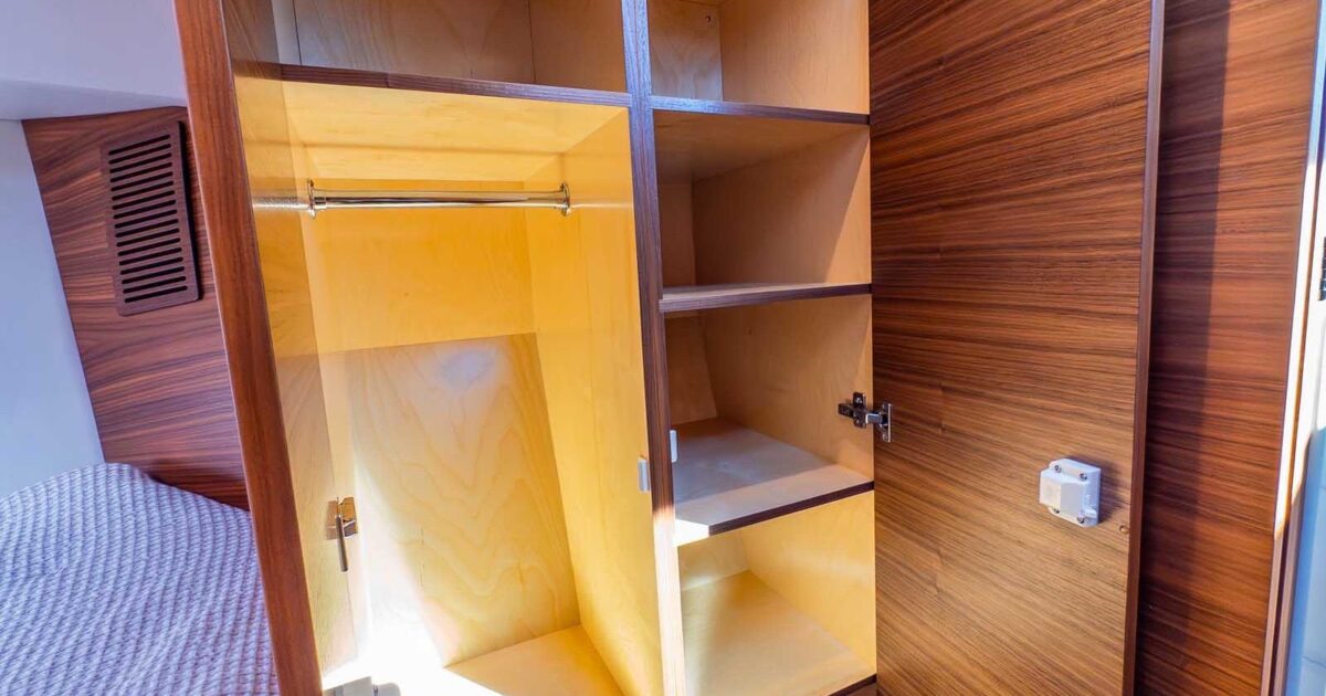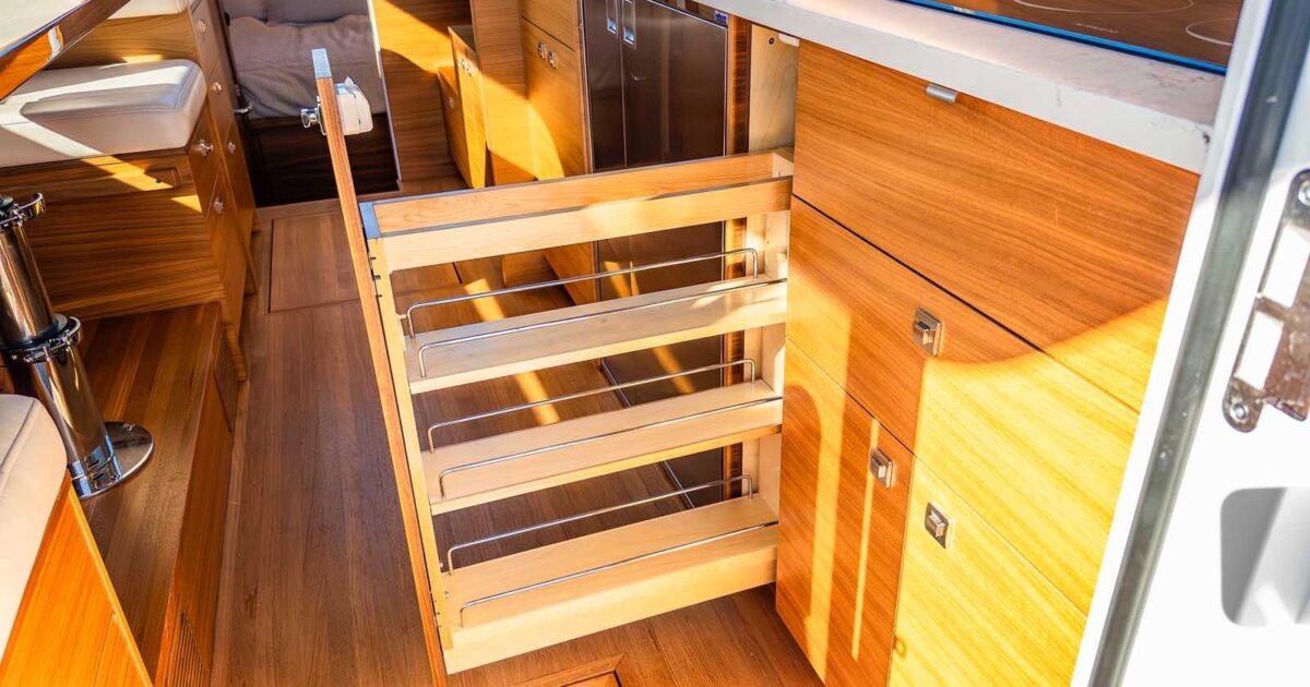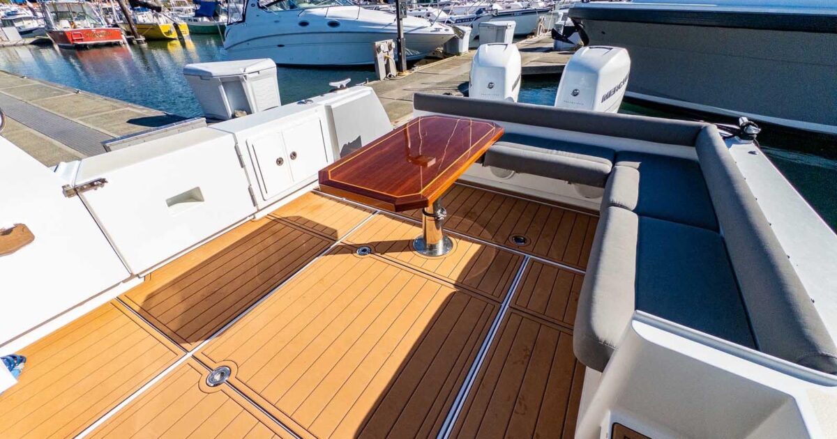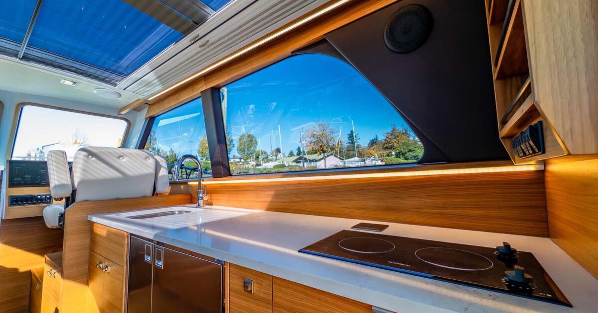 Inside, the 33 Express Fish offers true yacht-level comfort. The interior showcases handcrafted teak cabinetry and flooring, premium materials, and a level of finish rarely found in this size class. The salon provides a panoramic helm view and transforms effortlessly between open-air cruising and full weather protection. Open the sunroof and wide aft doors to invite in the fresh air and sound of the sea, or close them to enjoy a fully enclosed, temperature-controlled space.