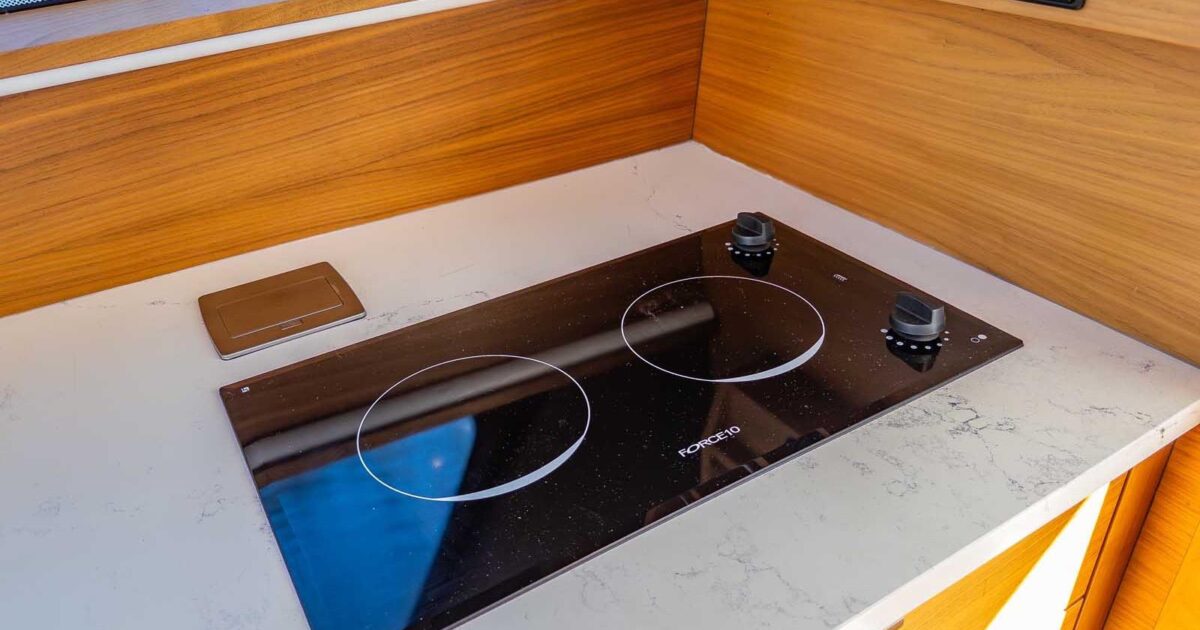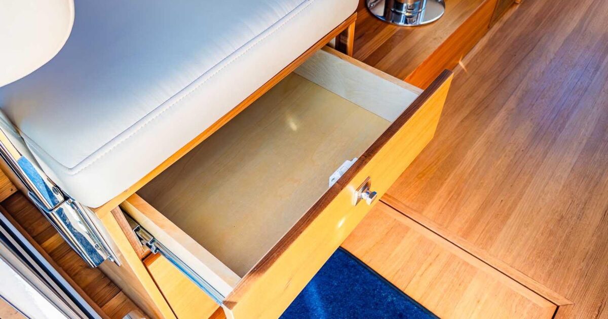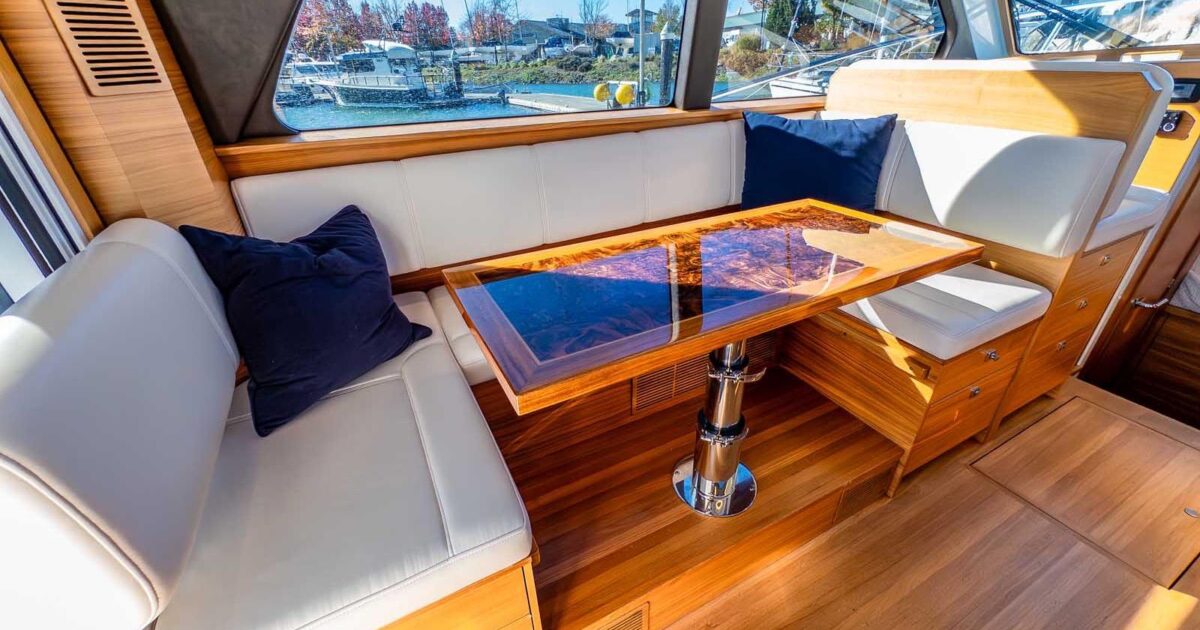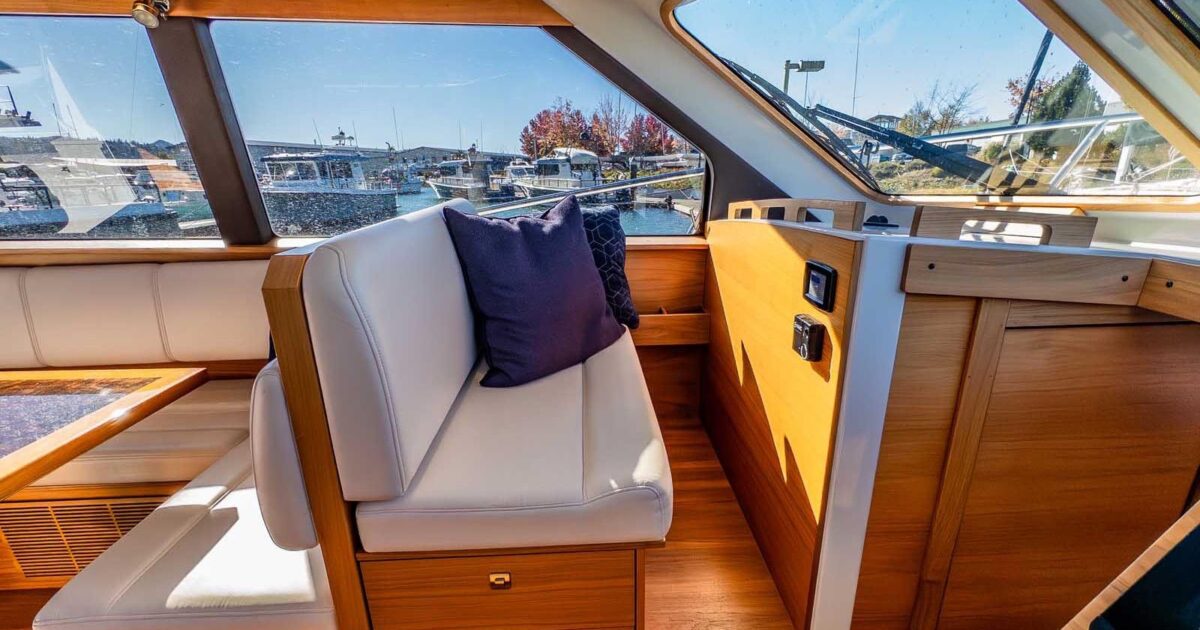 - Port-side settee with seating for 5 (storage beneath, removable aft backrest)