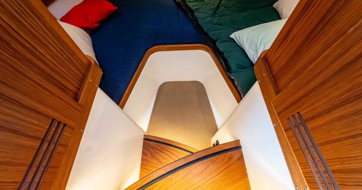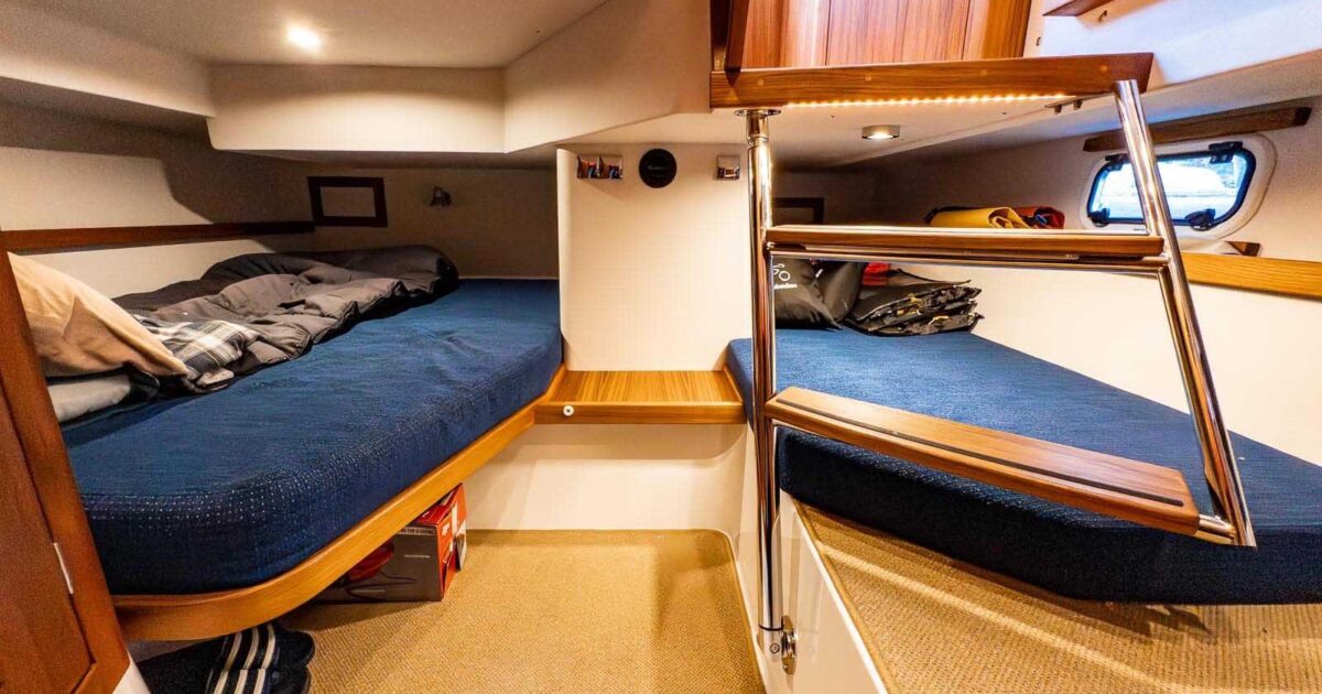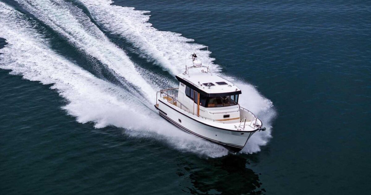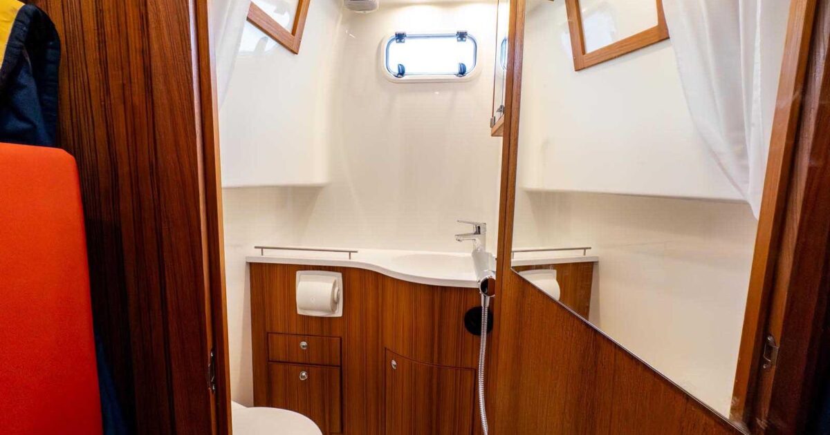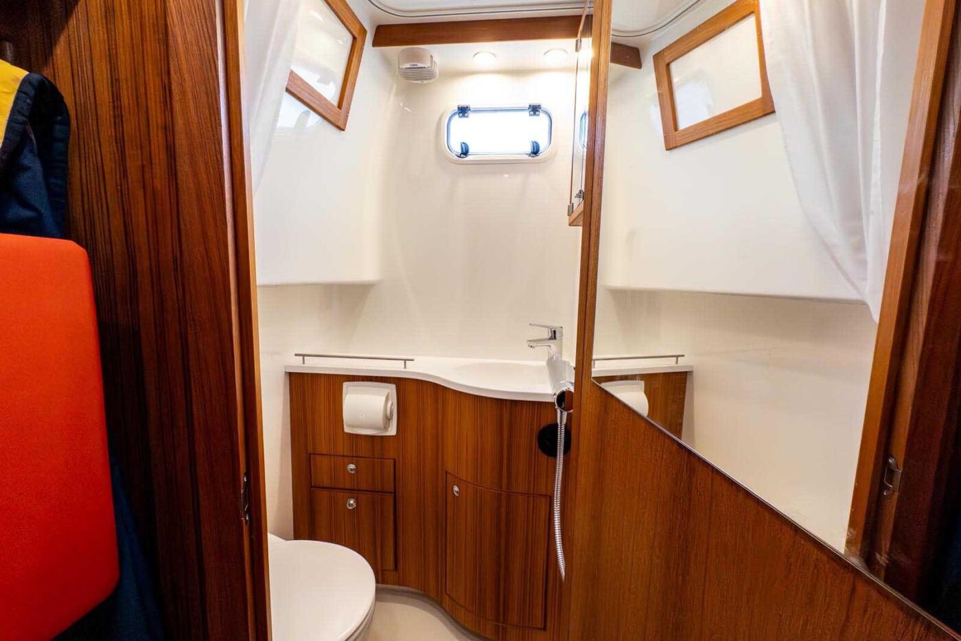 Below decks, two private cabins sleep four comfortably, with a bright salon, well-equipped galley, and thoughtful stowage throughout. On deck, wide walk-around side decks, high bulwarks, and stainless rails give a sense of security at sea. The Coupé version features a straight roofline and single-engine layout for reduced height and weight—ideal for covered moorage and efficient cruising.