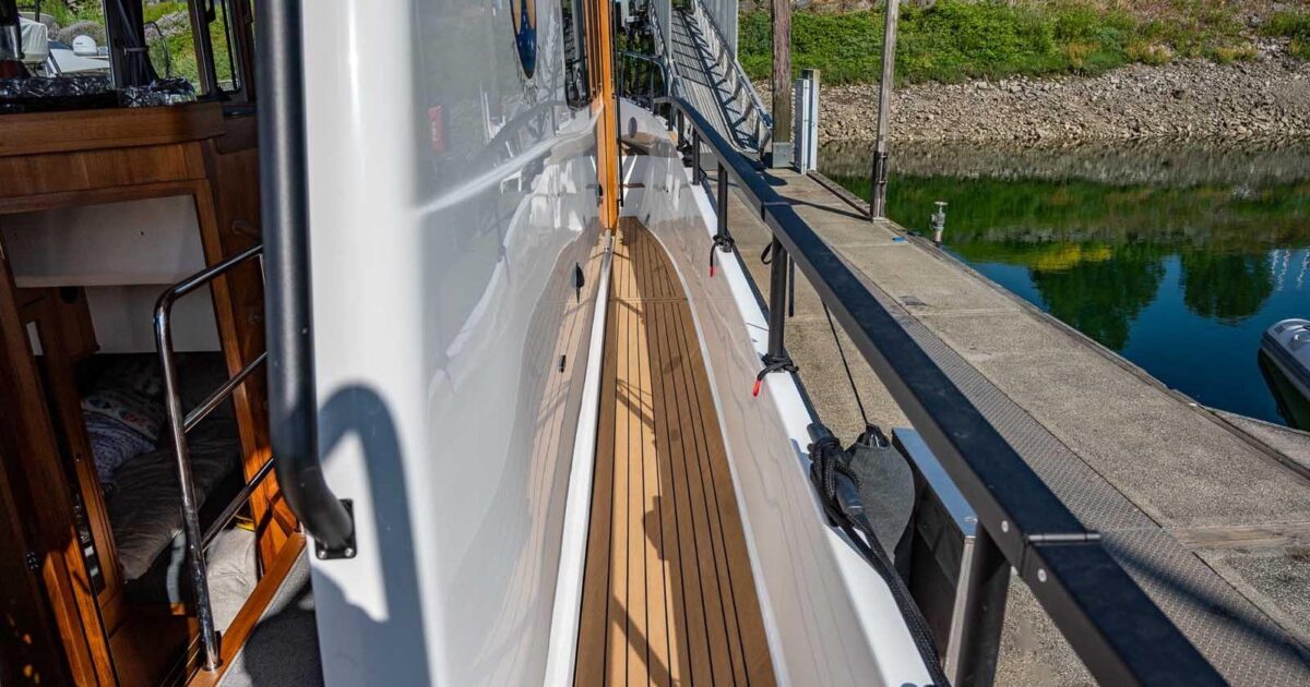 - Flexiteek ("Teak" + black caulking) deck complete - Aft Deck, Side Passages, Fore Passages, Steps to Fb, and Fb