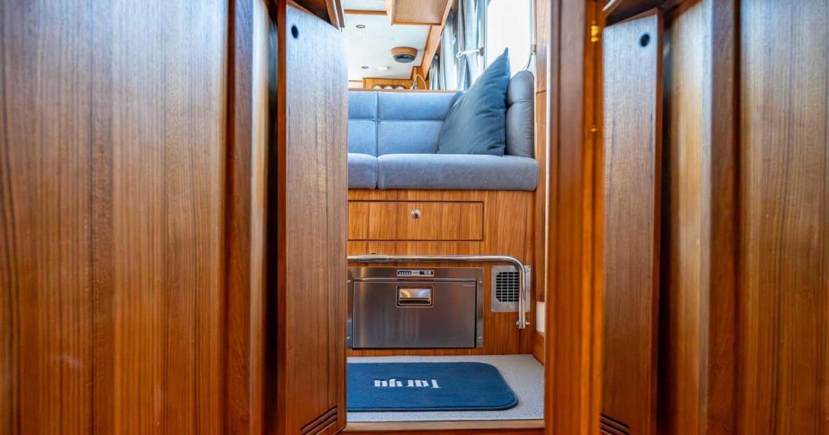 - Teak storage box above passenger sofa on Pt-side flip up doors - No teak cupboard in the ceiling above fwd passenger sofa