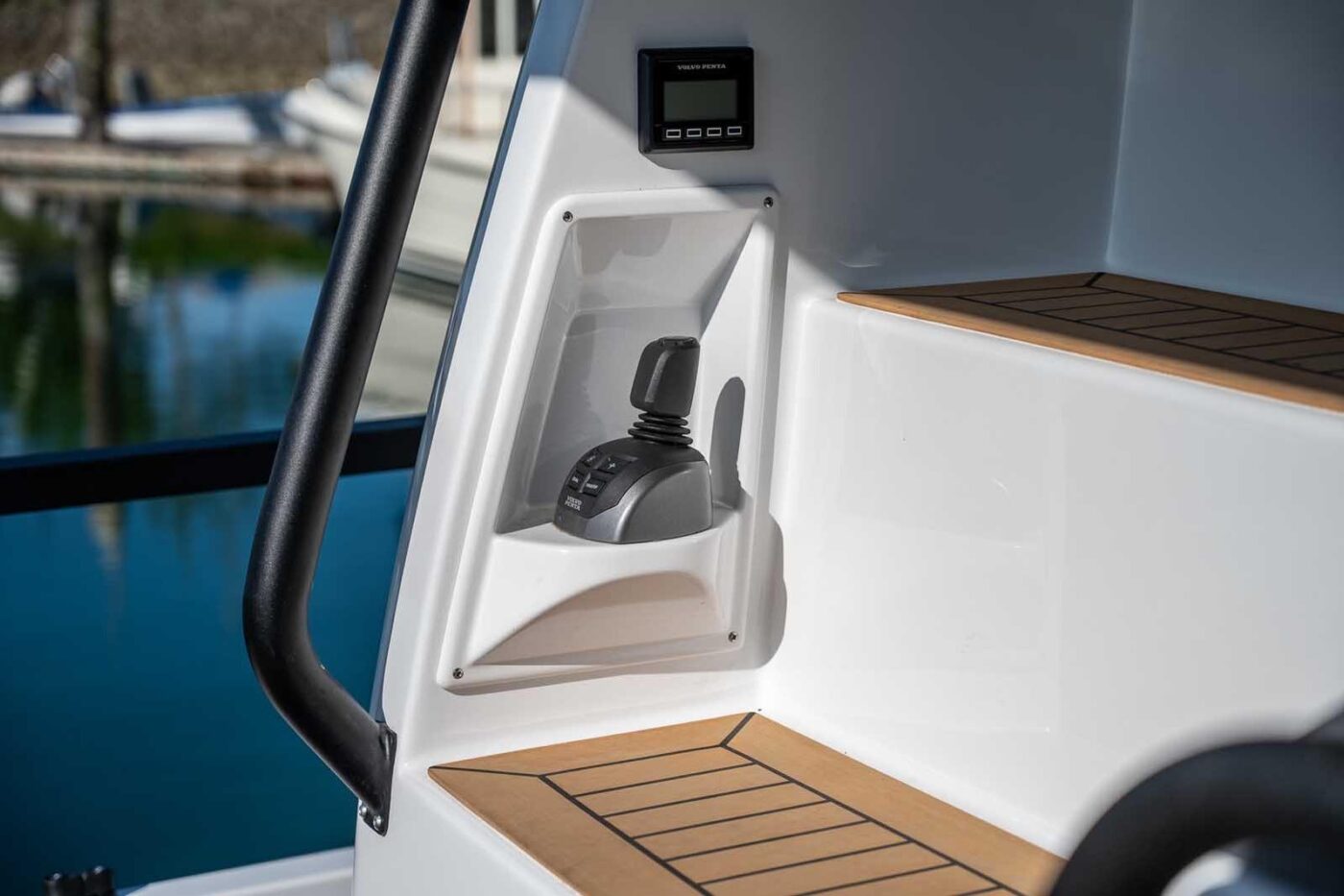 - Angled teak box for twin plotter in front of steering wheel
