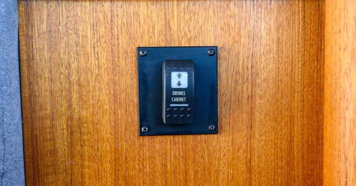 - Powered liquor cabinet in place of hi-low TV at fwd end of settee with 2 shelves for 14" (36cm) bottles (or tallest possible shelves)