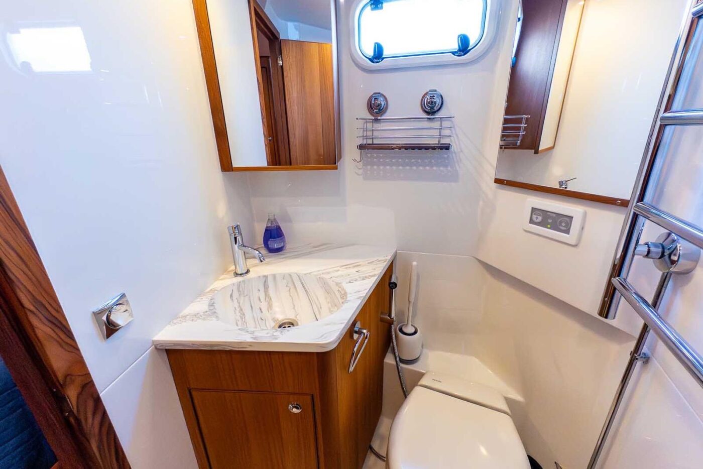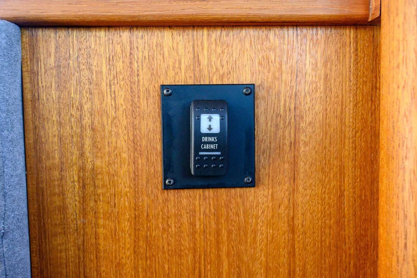 - Teak storage box above passenger sofa on Pt-side flip up doors - No teak cupboard in the ceiling above fwd passenger sofa